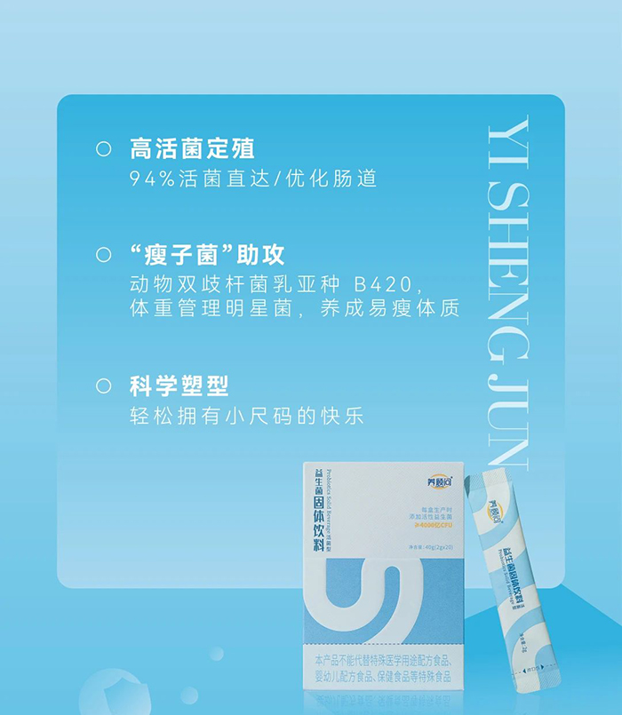 睡前半小時,來自養顧問益生菌的溫柔呵護,為腸道筑牢一道防御屏障,特別令人期待的是,它所含有的B420菌株,是助力馬甲線、A4腰的王炸成分,“瘦子菌”這個頭銜實至名歸;