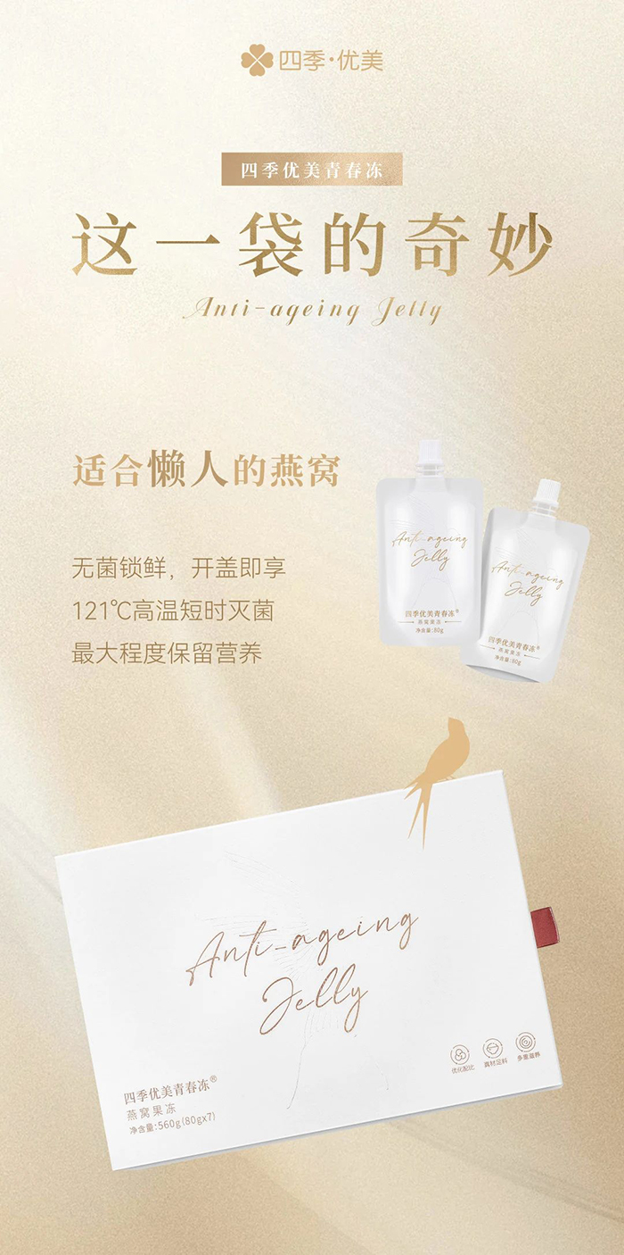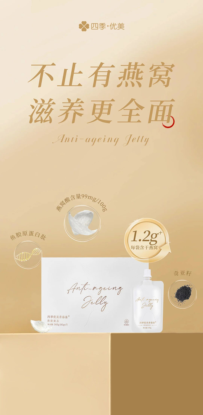 在飲食美學(xué)的殿堂里,燕窩以其獨(dú)特的韻味,詮釋著“少即是多”的哲學(xué)。無需繁復(fù)的調(diào)味,僅以清水慢燉,便能激發(fā)出它最本真的甘甜與細(xì)膩。這份簡約,恰如人生中的留白,值得無限的回味與遐想。同時,燕窩又是“兼容并包”的食材典范,無論是百合、雪梨,還是木瓜、芒果,或者枸杞、紅棗,都能與它擦出動人的火花,演繹出舌尖上的美好。就像這一袋四季優(yōu)美青春凍,除了至少1.2克的可溯源優(yōu)質(zhì)干燕窩之外,還貼心地根據(jù)現(xiàn)代人的身體所需,額外加入了魚膠原蛋白肽、葛根粉、奇亞籽、水蘇糖、低聚木糖、低聚果糖等多種原料,使四季優(yōu)美青春凍在營養(yǎng)價值、飽腹感及產(chǎn)品綜合體驗方面,都實(shí)現(xiàn)了顯著的提升,為追求“清、調(diào)、補(bǔ)、養(yǎng)、固”的消費(fèi)者們帶來更值得期待的選擇。